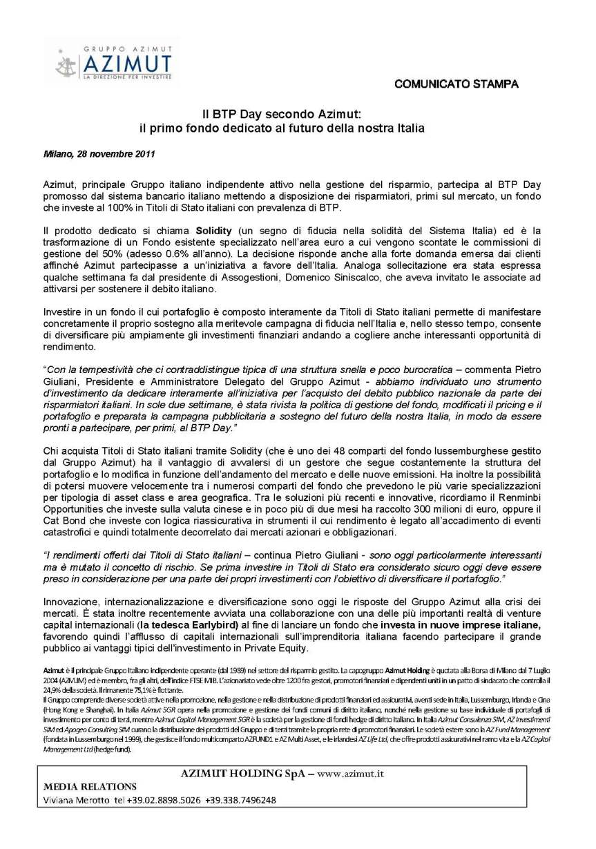 BTP Day Di seguito il comunicato stampa e una spiritosa locandina relativi all’iniziativa del BTP Day. Il comparto Solidity sarà interamente dedicato all’acquisto di titoli di Stato italiani. Condividi: Invia un link a un amico via e-mail (Si apre in una nuova finestra) E-mail Stampa (Si apre in una nuova finestra) Stampa Condividi su Facebook (Si apre in una nuova finestra) Facebook Condividi su LinkedIn (Si apre in una nuova finestra) LinkedIn Condividi su WhatsApp (Si apre in una nuova finestra) WhatsApp Condividi su X (Si apre in una nuova finestra) X Mi piace Caricamento... Correlati