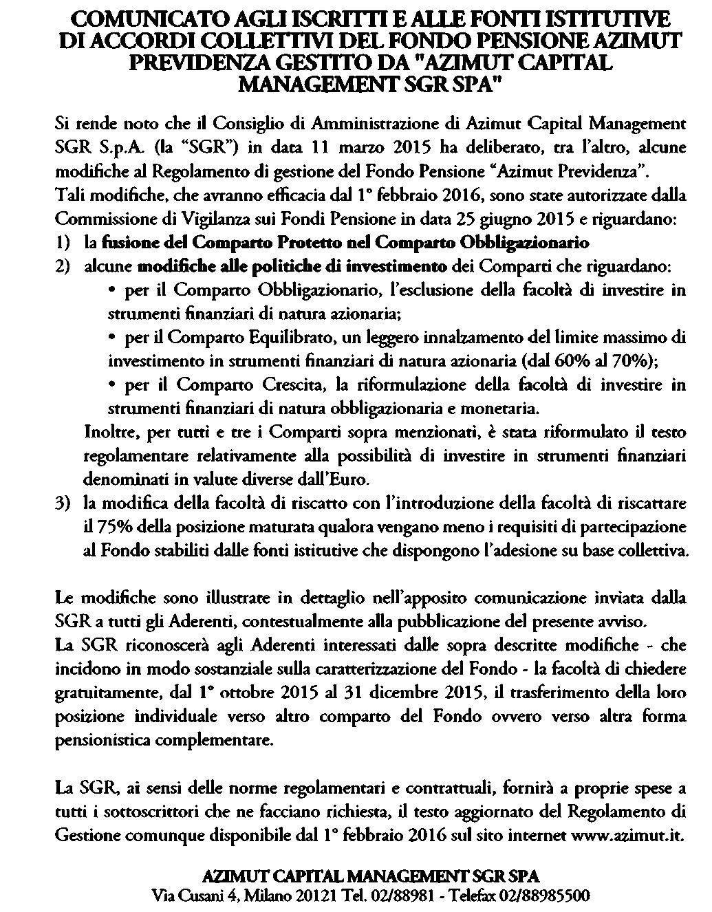 Comunicato fondo pensione Azimut Previdenza