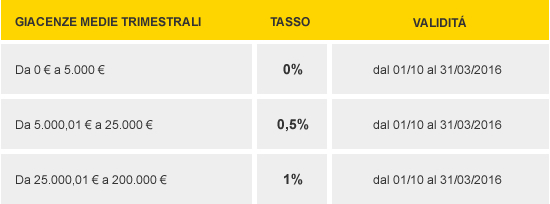 Se non si verificano le condizioni sopra esposte, CheBanca! in funzione della giacenza media trimestrale del Conto Yellow, ti riconoscerà comunque i tassi promozionali annui lordi sulle somme depositate riportati di seguito, validi dal 1 ottobre 2015 al 31 marzo 2016