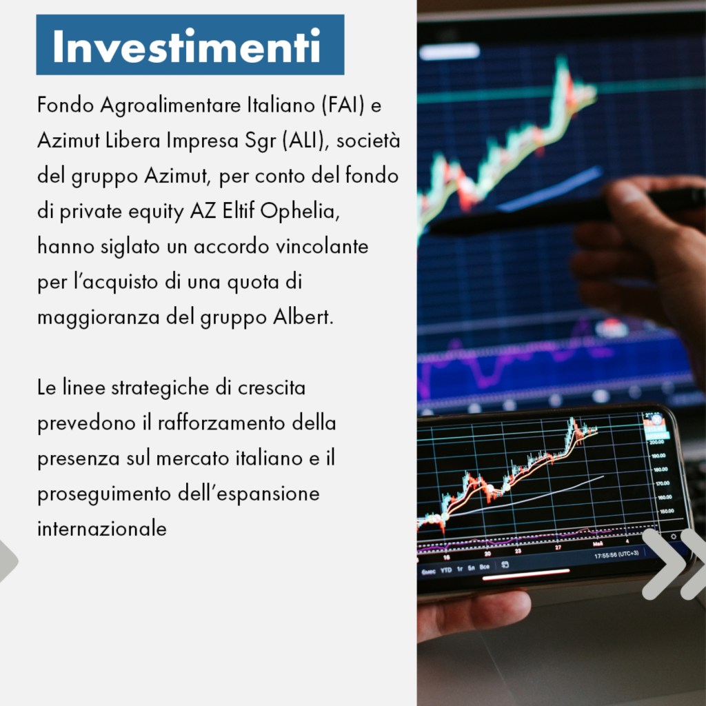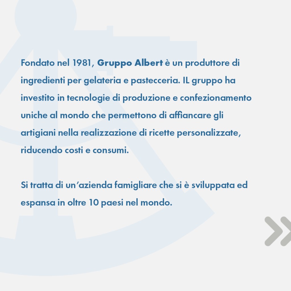 Fondato nel 1981, Gruppo Albert è uno storico produttore italiano di ingredienti per gelateria e pasticceria, con una presenza estera forte, che tocca quasi l’80% delle vendite. Azimut Libera Impresa, tramite https://www.azimutliberaimpresa.it/az-eltif-ophelia, ha siglato un accordo vincolante per l’acquisto di una quota di maggioranza insieme a Fondo Agroalimentare: scopri di più con #AzimutInvesteIn