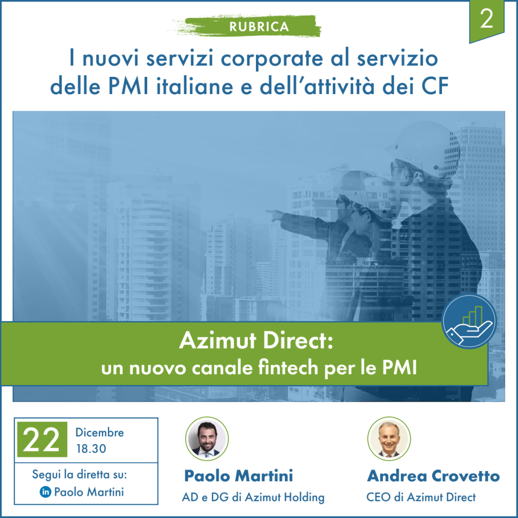 Mercoledì 22 dicembre alle ore 18.30, in diretta dal profilo di Paolo Martini e con la partecipazione di Andrea Crovetto CEO di Azimut Direct, si terrà in diretta la seconda puntata della rubrica dedicata ai servizi corporate a supporto delle PMI italiane e dell’attività dei consulenti finanziari.