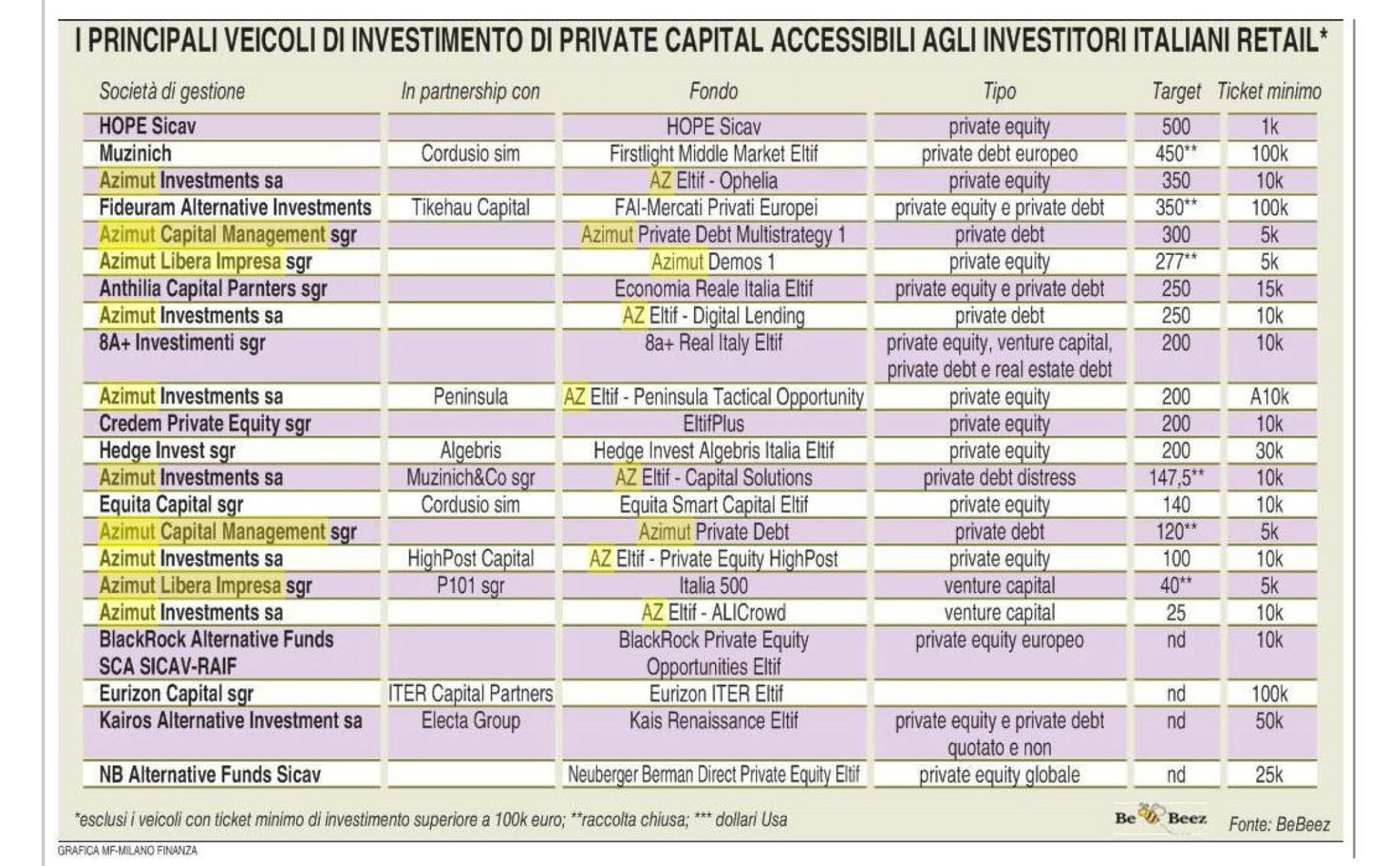Nei giorni scorsi è stato pubblicato dal quotidiano Milano Finanza un articolo che evidenzia come il Gruppo Azimut, nel mercato italiano, sia il leader nell’offerta agli investitori retail in ambito Private Capital (Private Equity, Private Debt, – Venture Capital).