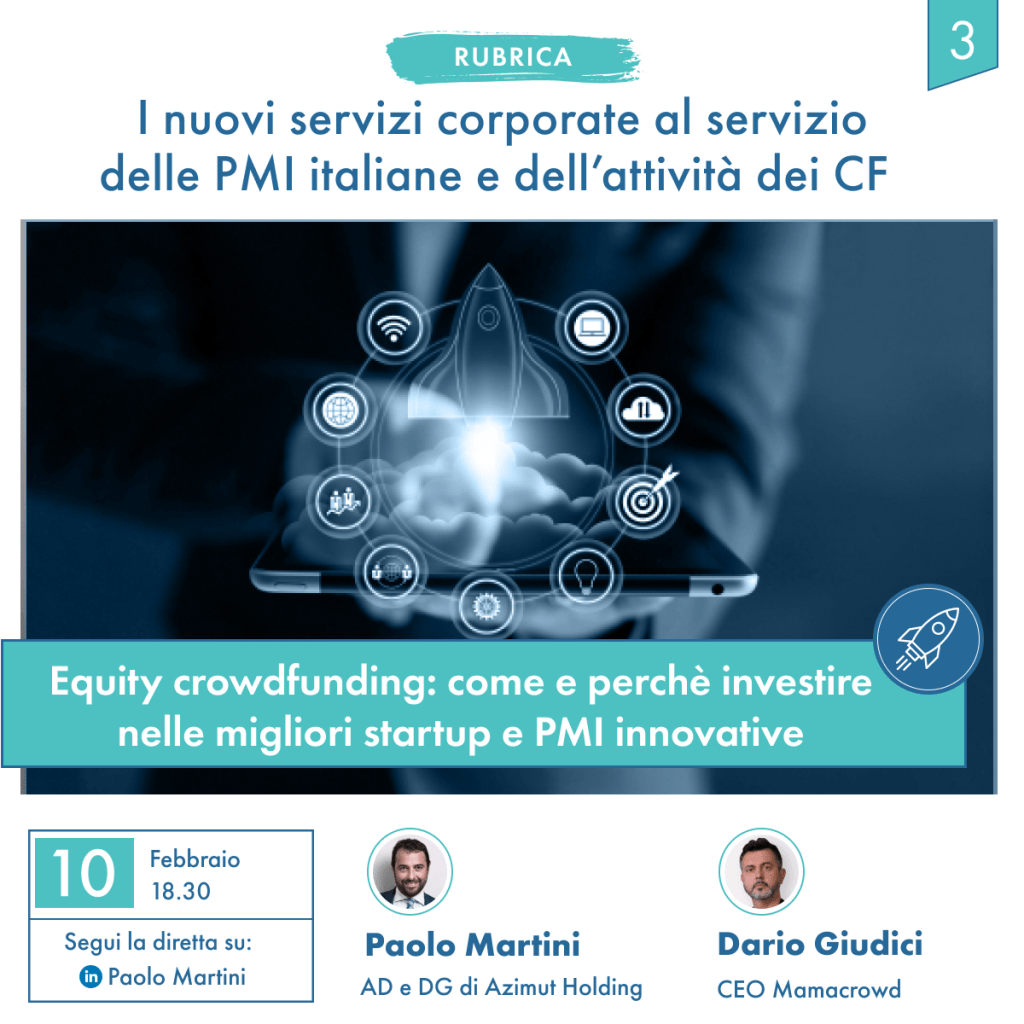 Save the date! Giovedì 10 febbraio alle ore 18.30, in diretta dal suo profilo LinkedIn, Paolo Martini condurrà la terza puntata della rubrica dedicata ai servizi corporate a supporto delle #pmi italiane e dell’attività dei consulenti finanziari. Ospite del nuovo appuntamento sarà Dario Giudici, CEO di Mamacrowd, la più importante piattaforma italiana per #investimenti in #equitycrowdfunding.