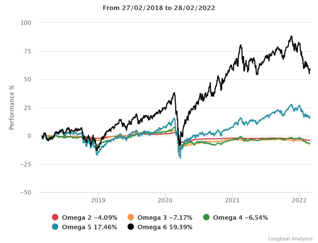 | Omega 4 | -6,54% | -1,68% | 5,4905 | -18,6986% | 0,9466 |