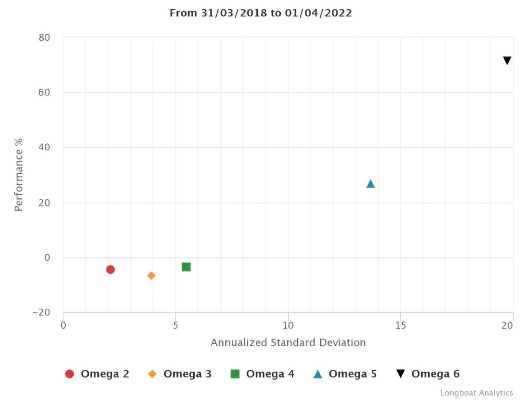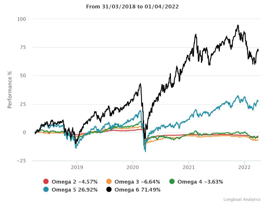 | Omega 4 | -3,63% | -0,92% | 5,4696 | -18,6986% | 0,9728 |