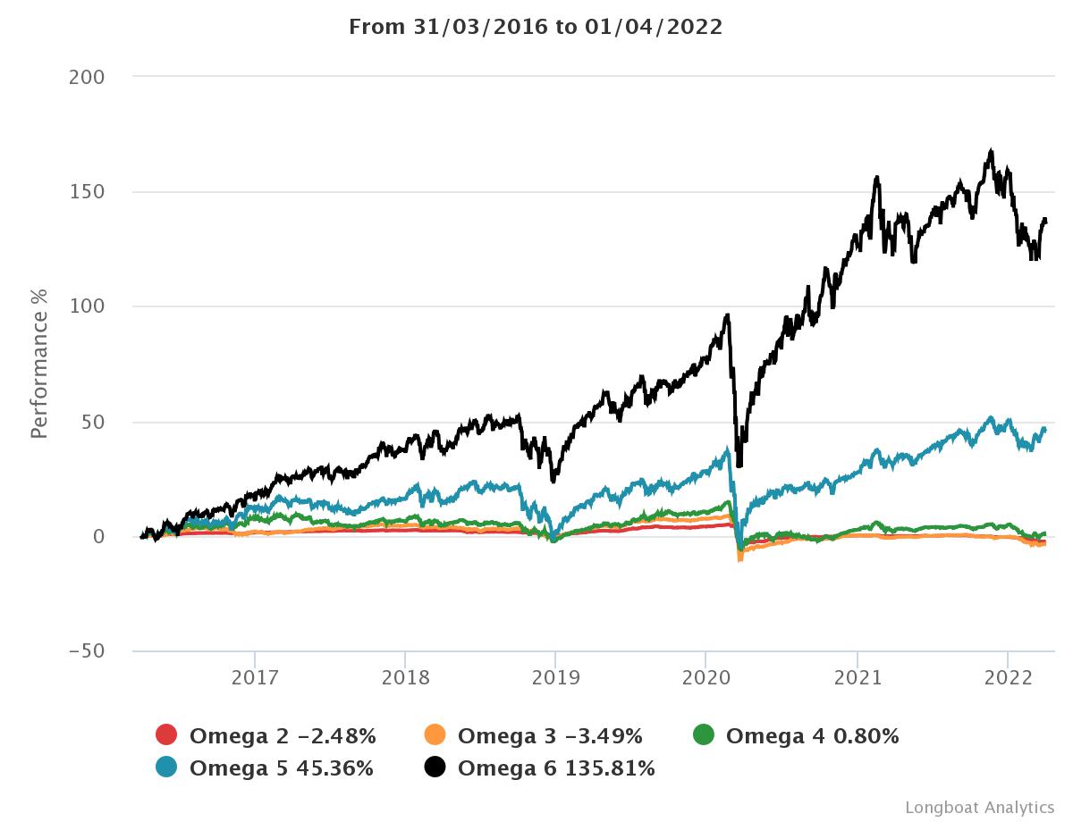 | Omega 6 | 135,81% | 15,36% | 17,2656 | -34,1986% | 1,1865 |
