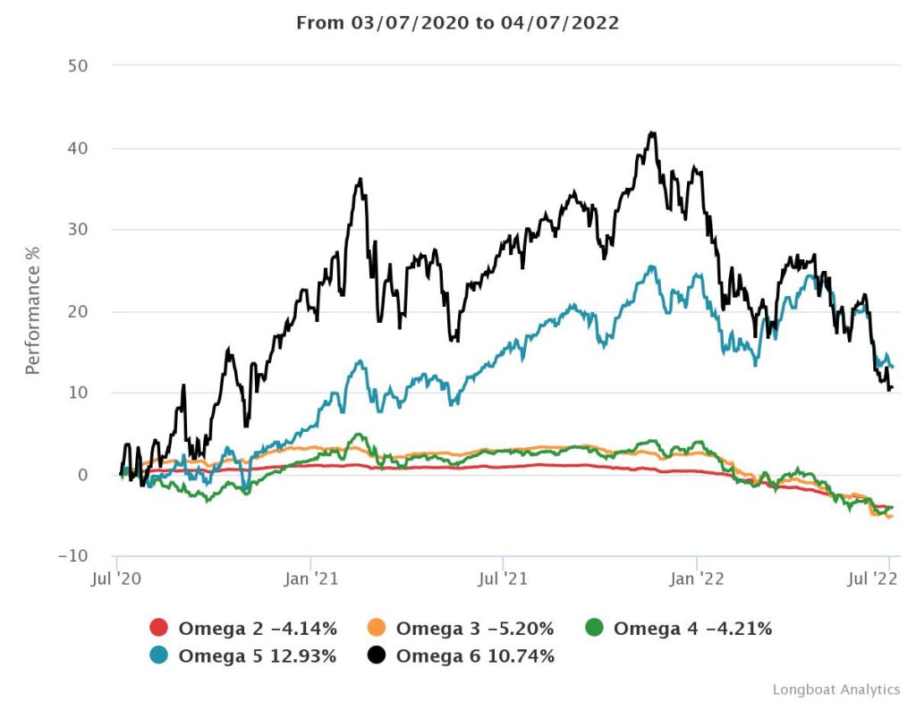 | Omega 5 | 12,93% | 6,26% | 8,4872 | -9,7919% | 1,1327 |