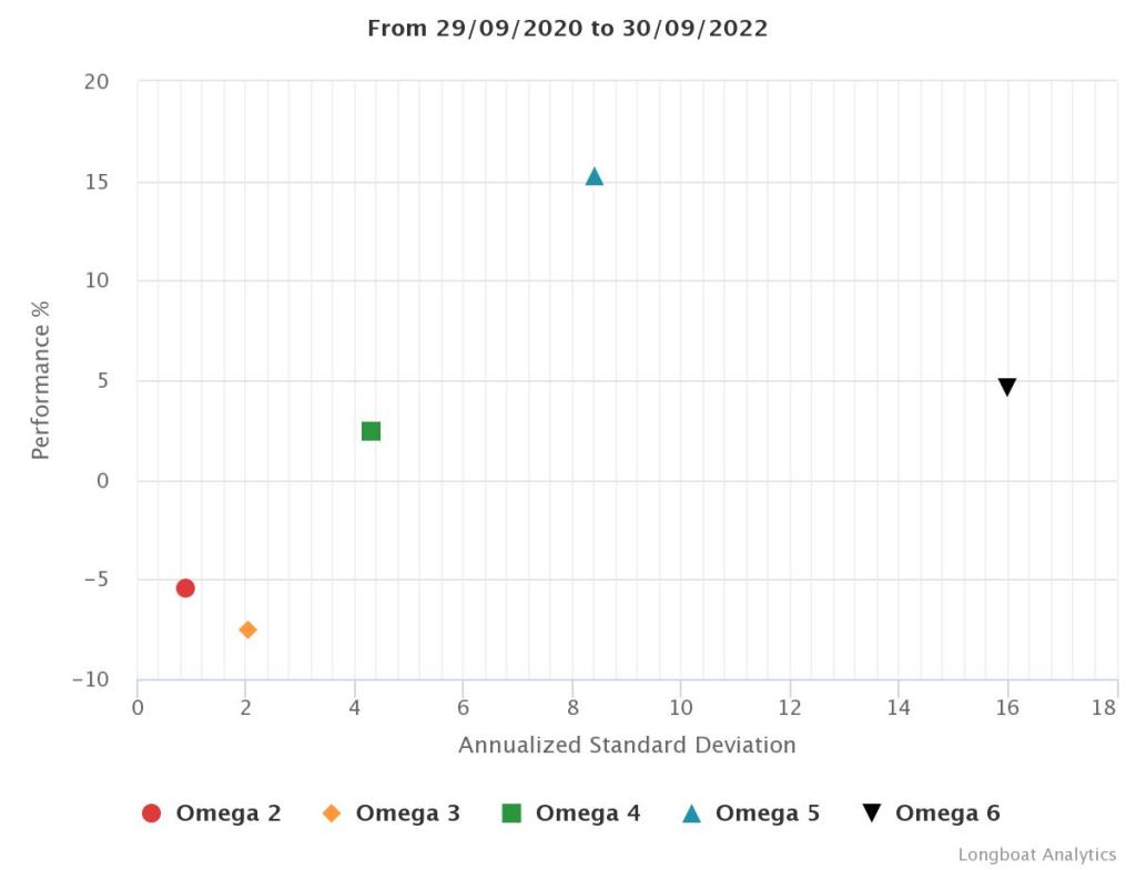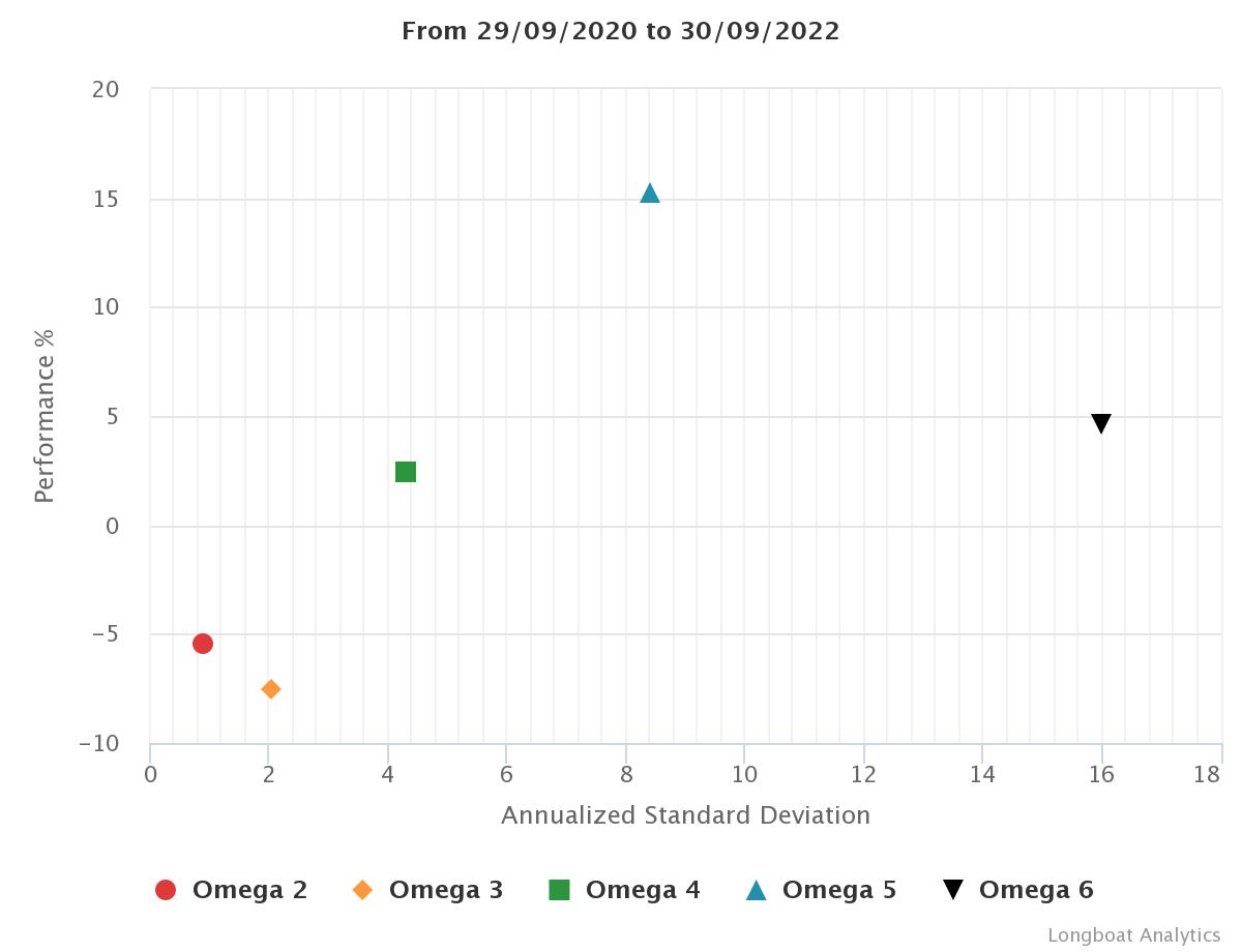| Omega 5 | 15,26% | 7,35% | 8,4246 | -9,9620% | 1,1544 |