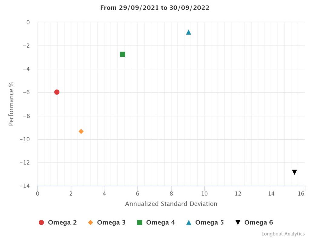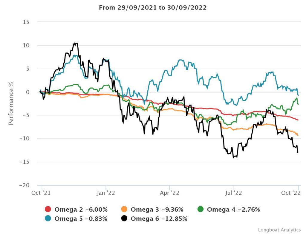 | Omega 6 | -12,85% | -12,82% | 15,3939 | -22,2951% | 0,8763 |