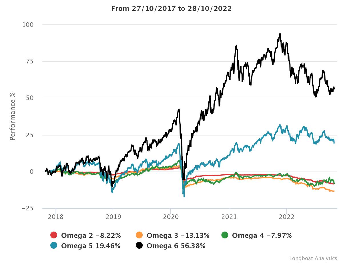 | Omega 4 | -7,97% | -1,65% | 5,5517 | -18,6986% | 0,9500 |