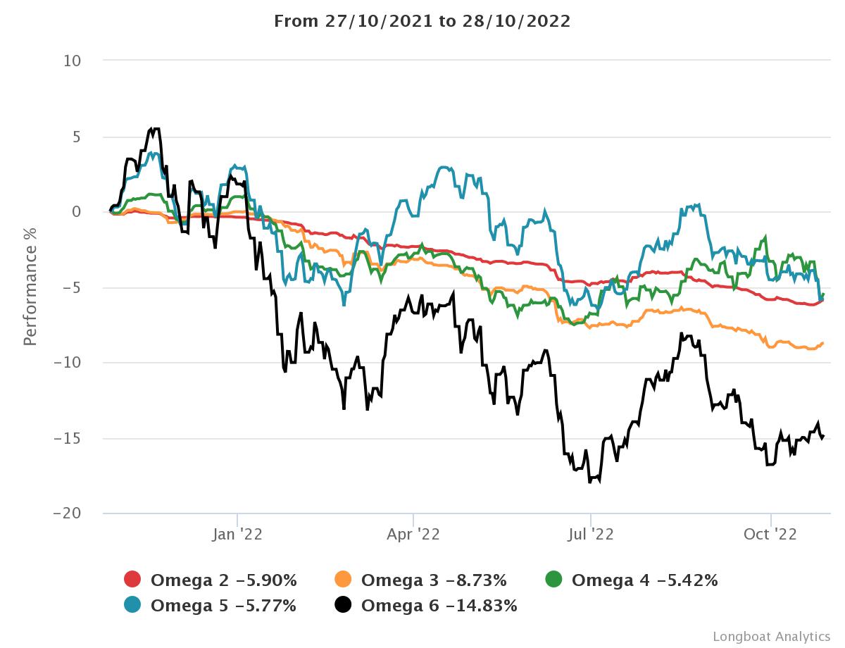 | Omega 4 | -5,42% | -5,41% | 5,6360 | -8,5729% | 0,8489 |