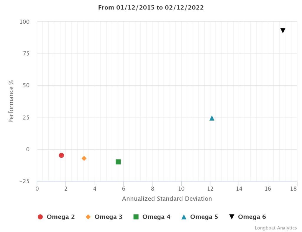 | Omega 5 | 24,63% | 3,19% | 12,1320 | -30,7982% | 1,0636 |