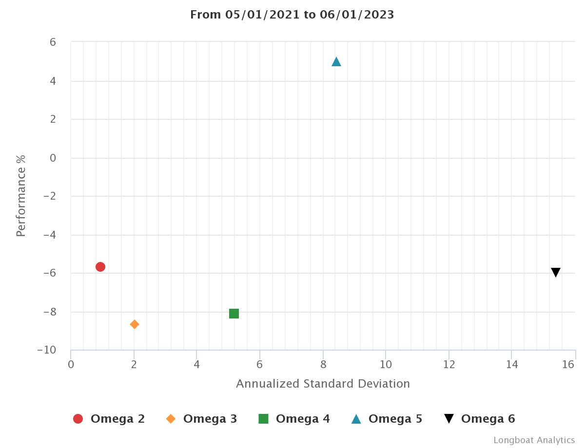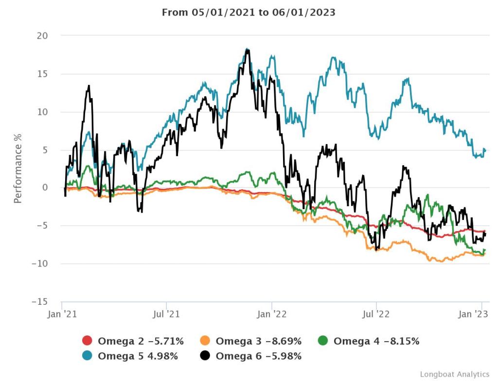| Omega 6 | -5,98% | -3,03% | 15,4144 | -22,2951% | 0,9798 |