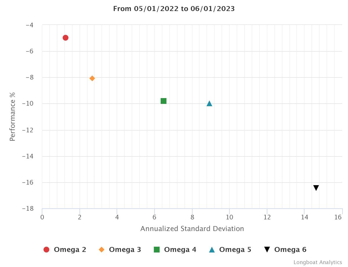 | Omega 5 | -9,98% | -9,95% | 8,9233 | -11,2208% | 0,8355 |