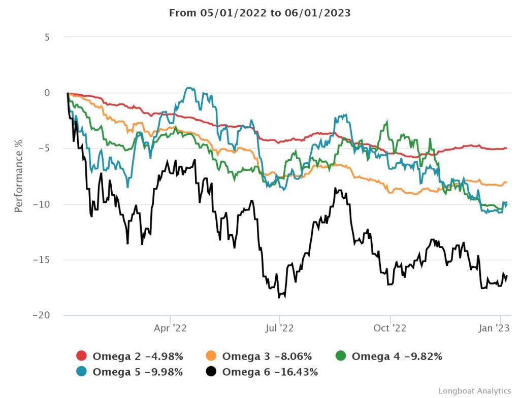 | Omega 6 | -16,43% | -16,39% | 14,6188 | -18,4859% | 0,8304 |
