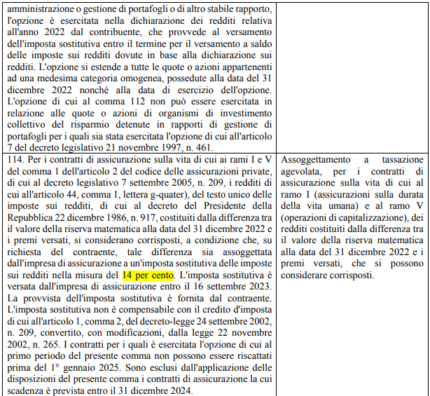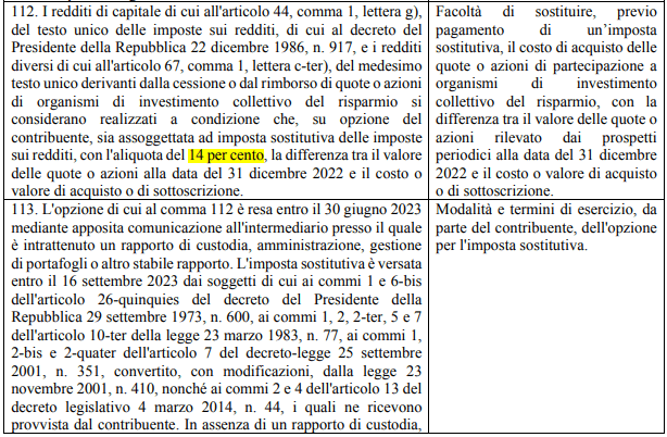 Legge di Bilancio 2023 – affrancamento quote di OICR e polizze assicurative Vi riporto il testo della legge di Bilancio che permette di affrancare le plusvalenze con un’imposta al 14% invece dell’ordinaria 26%. Il cliente dovrà fare richiesta entro il 30 giugno 2023 Condividi: Fai clic per inviare un link a un amico via e-mail (Si apre in una nuova finestra) E-mail Fai clic qui per stampare (Si apre in una nuova finestra) Stampa Fai clic per condividere su Facebook (Si apre in una nuova finestra) Facebook Fai clic qui per condividere su LinkedIn (Si apre in una nuova finestra) LinkedIn Fai clic per condividere su WhatsApp (Si apre in una nuova finestra) WhatsApp Fai clic per condividere su X (Si apre in una nuova finestra) X Mi piace Caricamento... Correlati