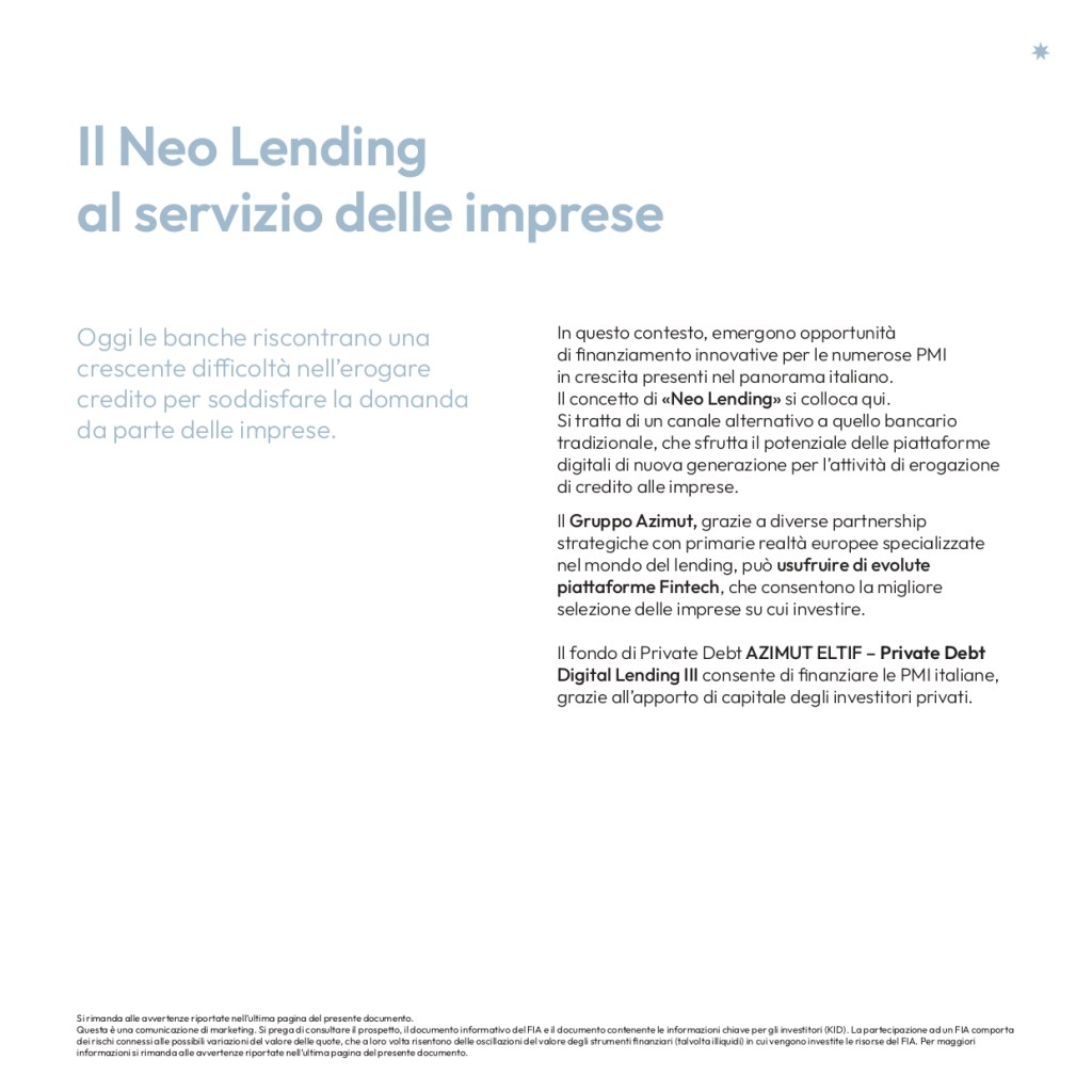 Nuovo comparto di private debt la cui strategia di investimento è basata su prestiti e crediti di pmi italiane acquistati sulle principali piattaforme fintech italiane.