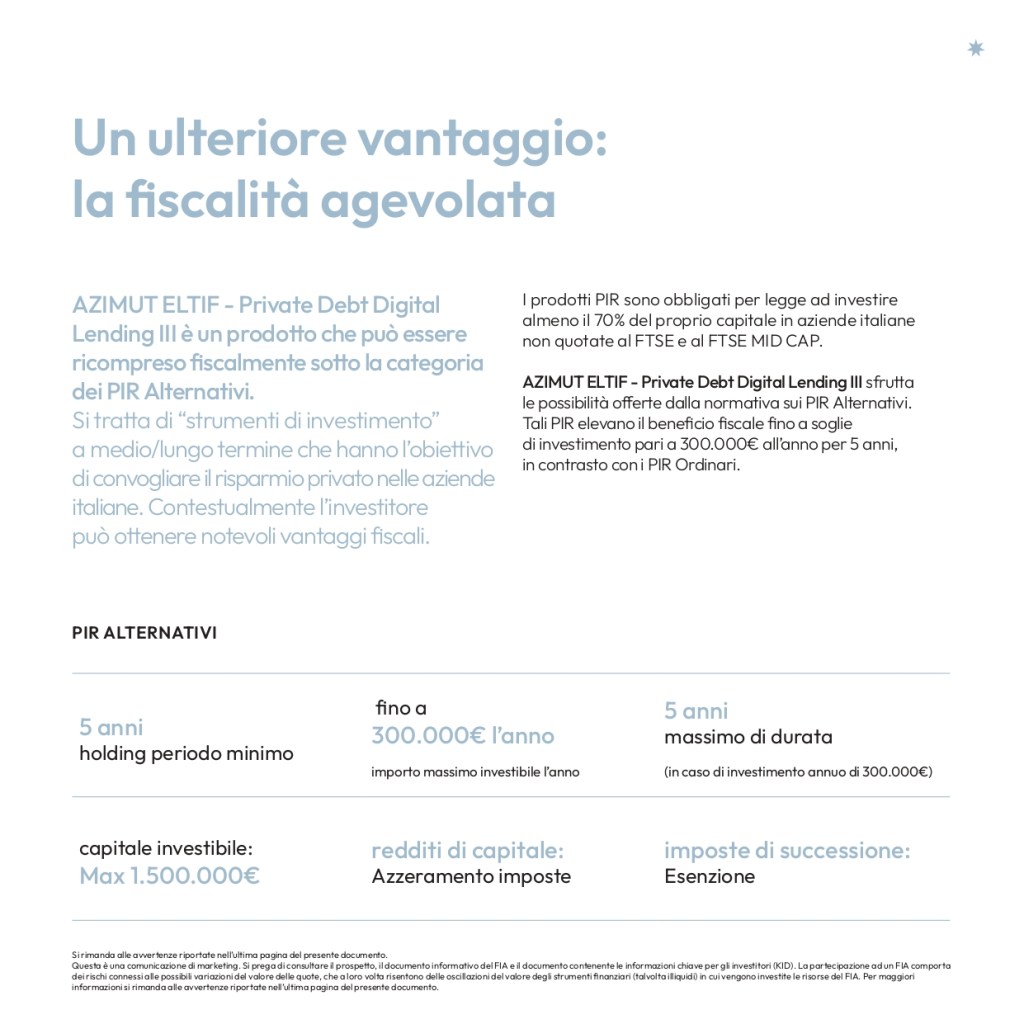 Il fondo consentirà di usufruire del beneficio fiscale introdotto dalla normativa sui “PIR alternativi” a favore delle persone fisiche residenti in Italia (esenzione imposta di successione, azzeramento tassazione sulle plusvalenze).