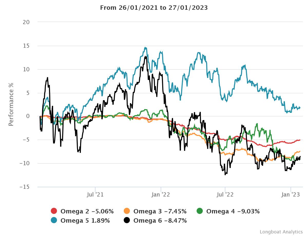 | Omega 3 | -7,45% | -3,79% | 2,0614 | -9,8868% | 0,6947 |