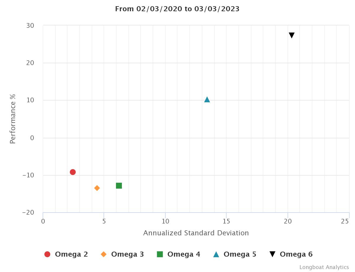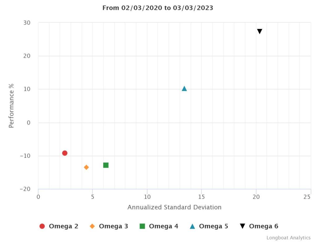 | Omega 5 | 10.30% | 3.32% | 13.4363 | -23.4282% | 1.0691 |