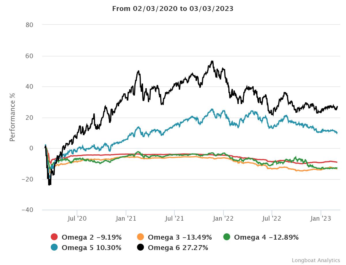 | Omega 4 | -12.89% | -4.50% | 6.2343 | -14.9906% | 0.8689 |