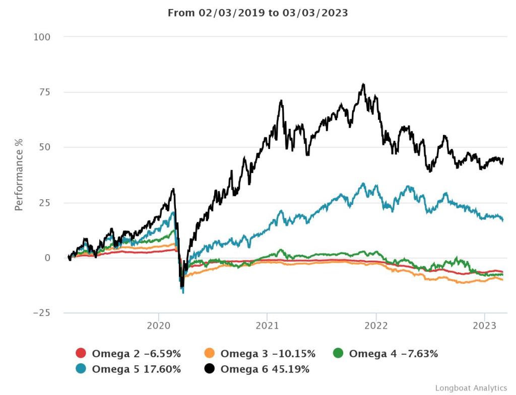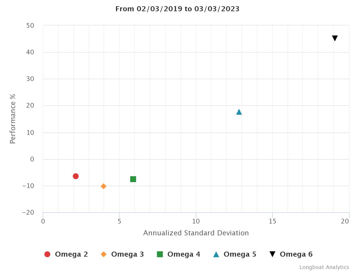 | Omega 4 | -7.63% | -1.96% | 5.8960 | -18.6986% | 0.9422 |