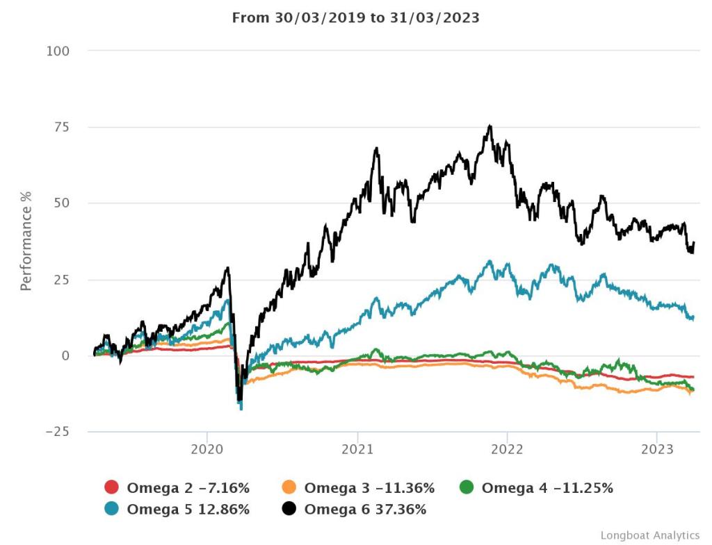 | Omega 4 | -11.25% | -2.94% | 5.9964 | -19.8777% | 0.9135 |
