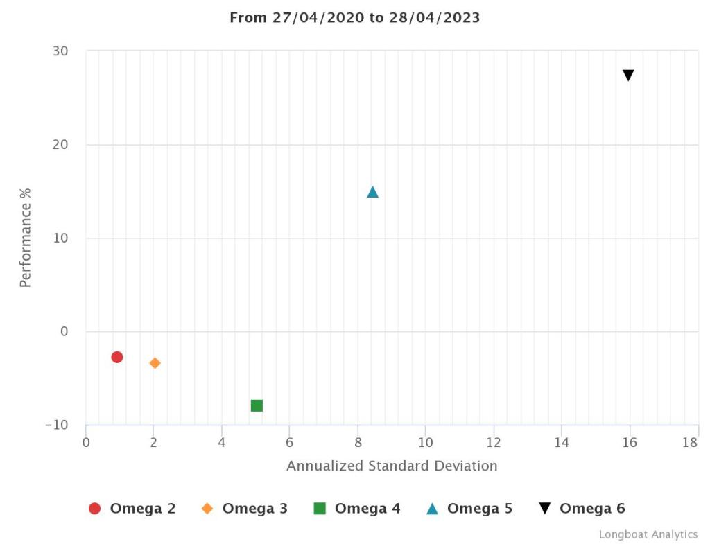 | Omega 5 | 14.90% | 4.74% | 8.4414 | -14.7126% | 1.1026 |
