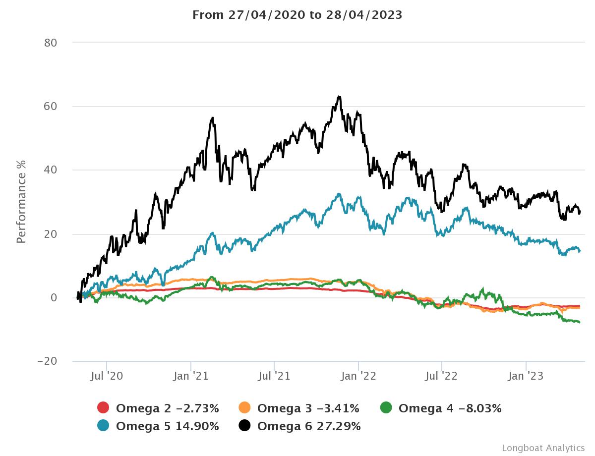 | Omega 3 | -3.41% | -1.15% | 2.0254 | -9.8868% | 0.9009 |