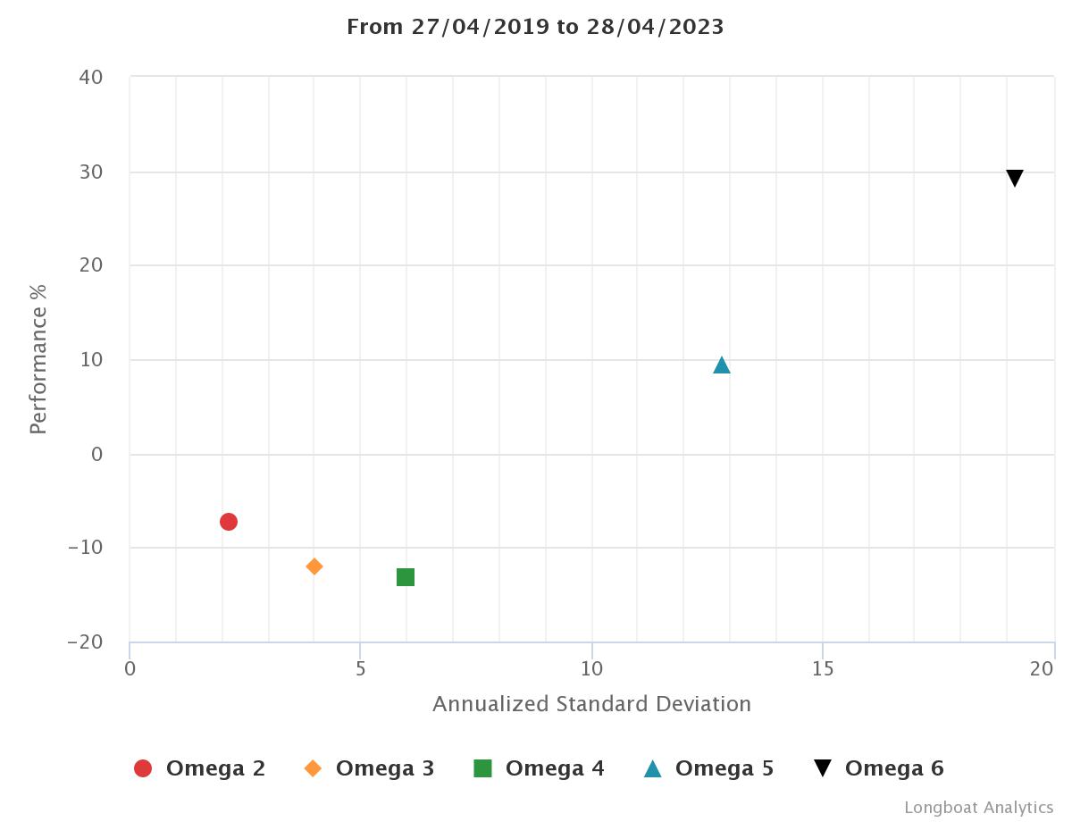 | Omega 4 | -13.17% | -3.47% | 5.9854 | -20.1094% | 0.8971 |