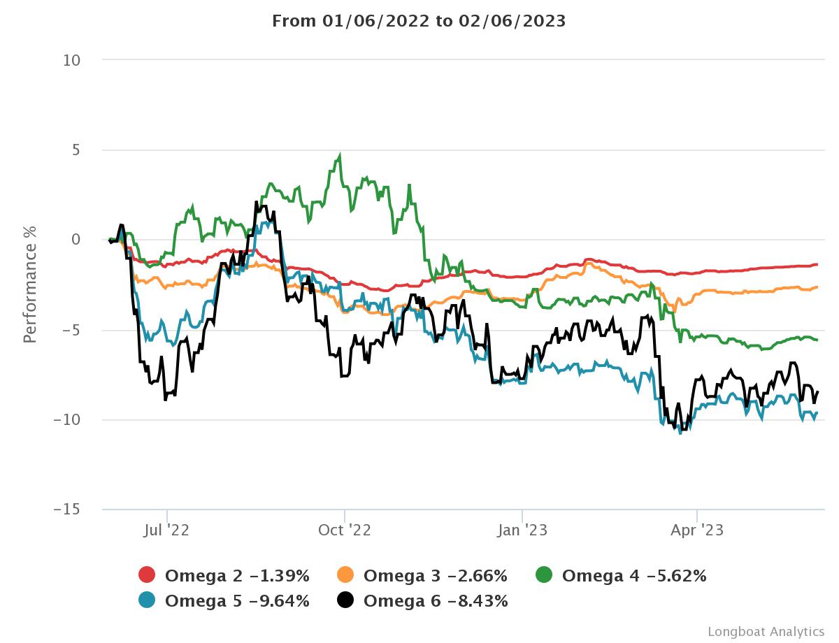 | Omega 6 | -8.43% | -8.42% | 11.5047 | -12.4557% | 0.8938 |