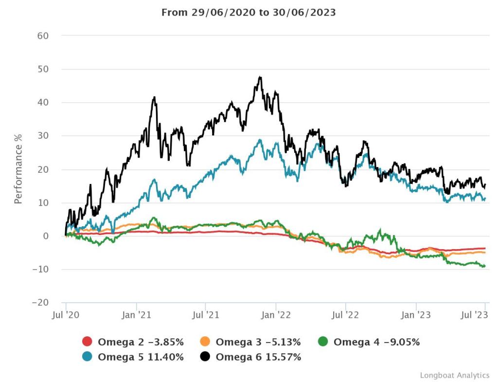 | Omega 3 | -5.13% | -1.74% | 1.9732 | -9.8868% | 0.8462 |