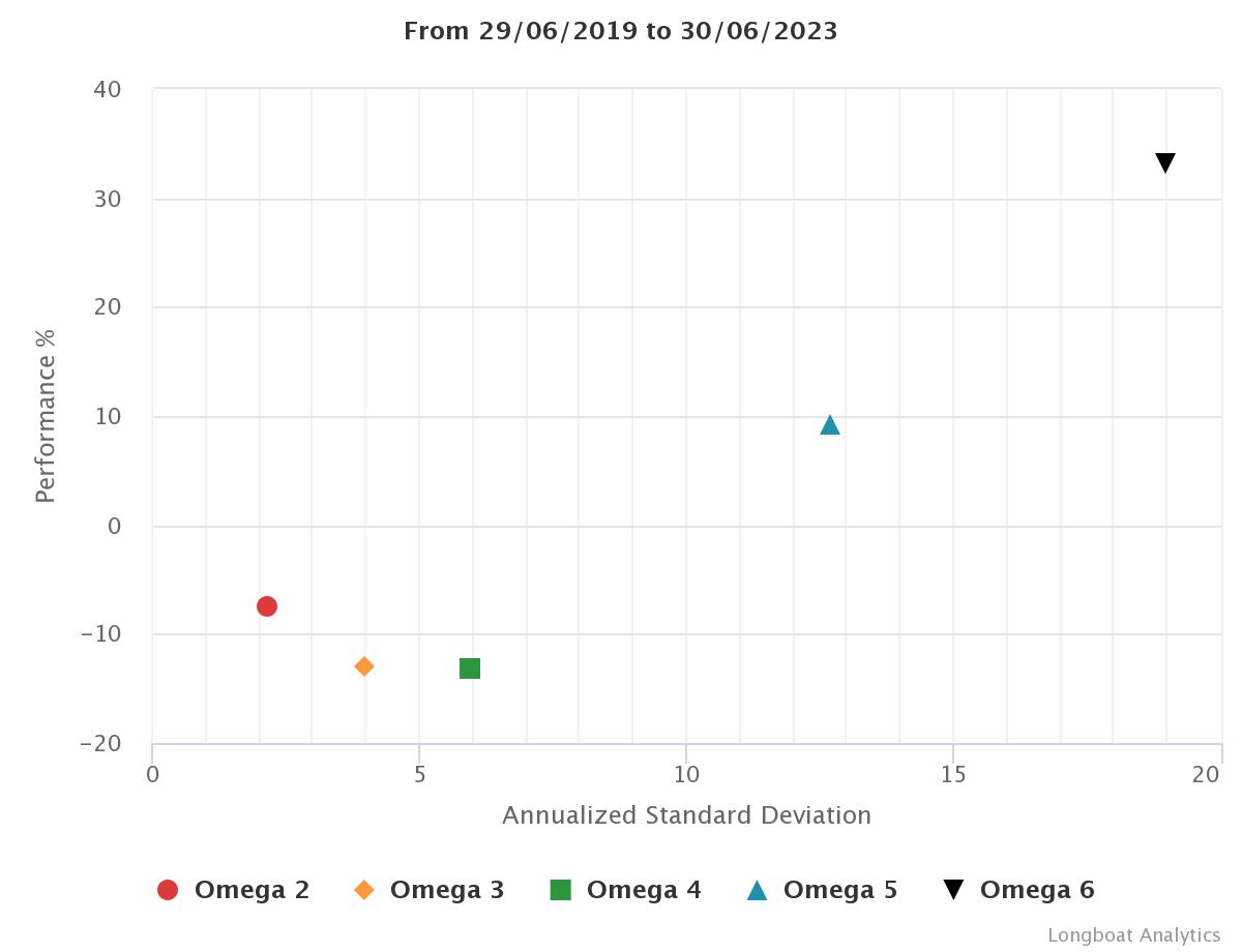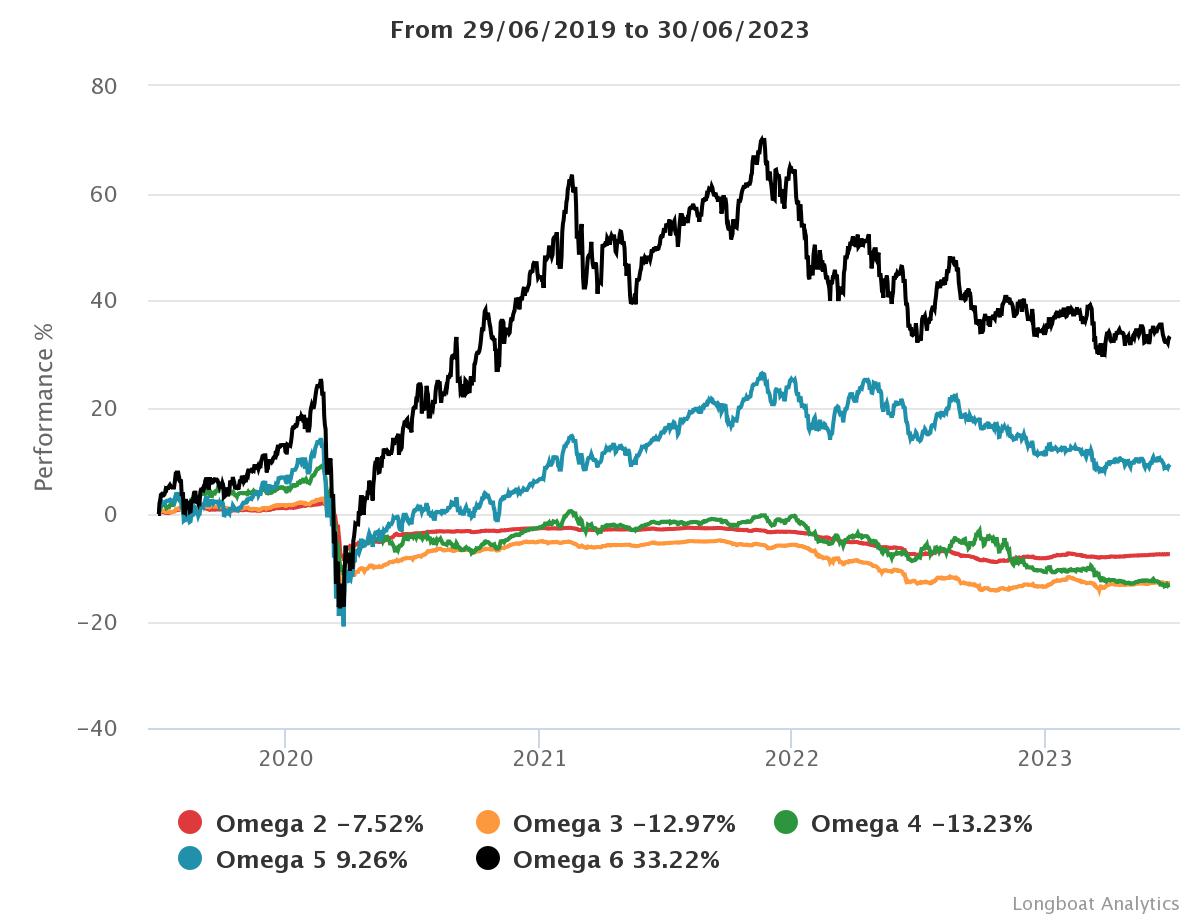 | Omega 4 | -13.23% | -3.48% | 5.9588 | -20.6263% | 0.8954 |