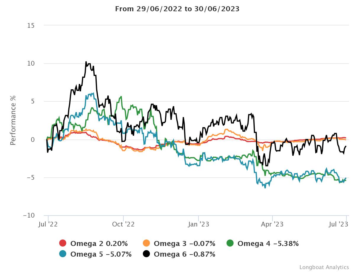 | Omega 6 | -0.87% | -0.86% | 10.9283 | -12.4557% | 0.9961 |