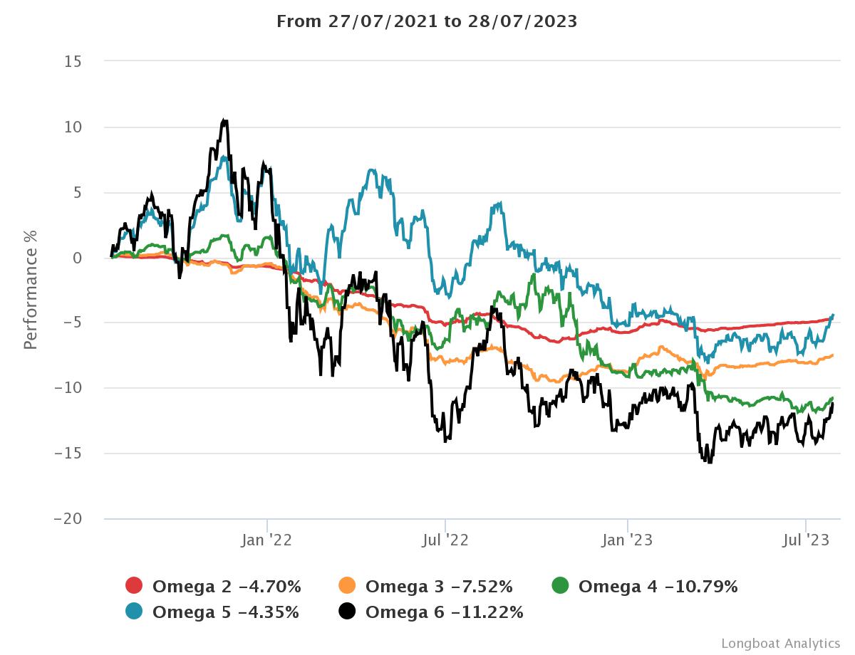 | Omega 4 | -10.79% | -5.55% | 5.2192 | -13.3142% | 0.8195 |