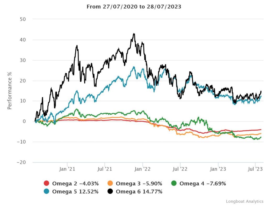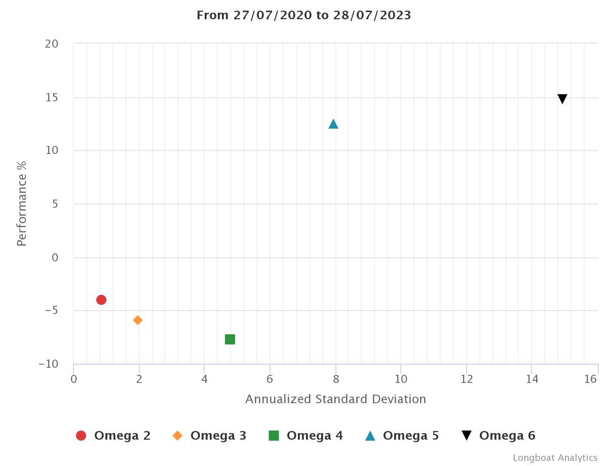 | Omega 4 | -7.69% | -2.63% | 4.7880 | -13.9871% | 0.9066 |