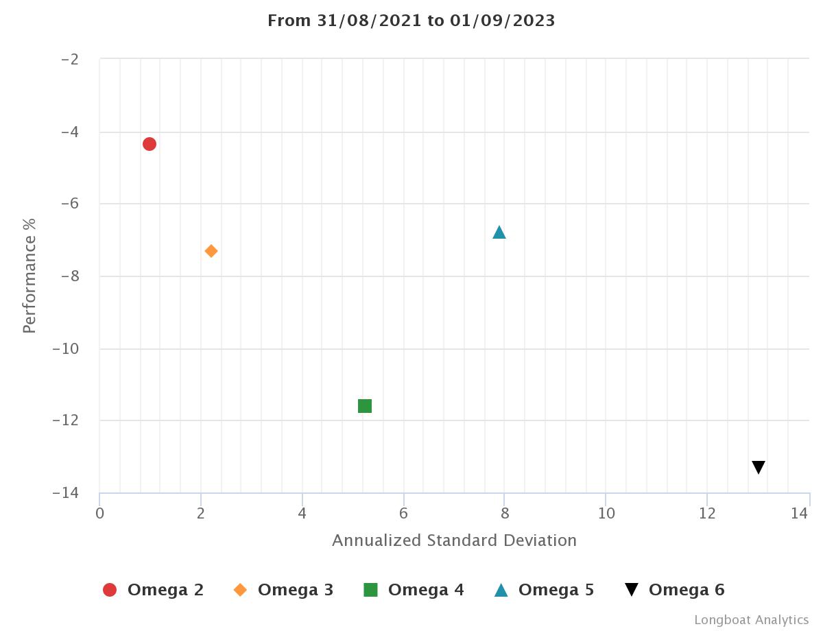 | Omega 4 | -11.60% | -5.98% | 5.2268 | -13.3142% | 0.8073 |