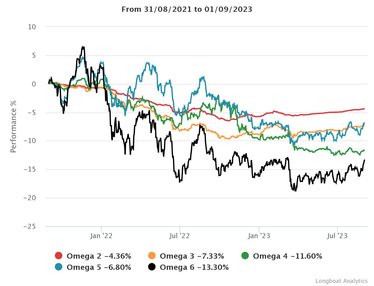 | Omega 6 | -13.30% | -6.89% | 13.0121 | -23.6615% | 0.9234 |