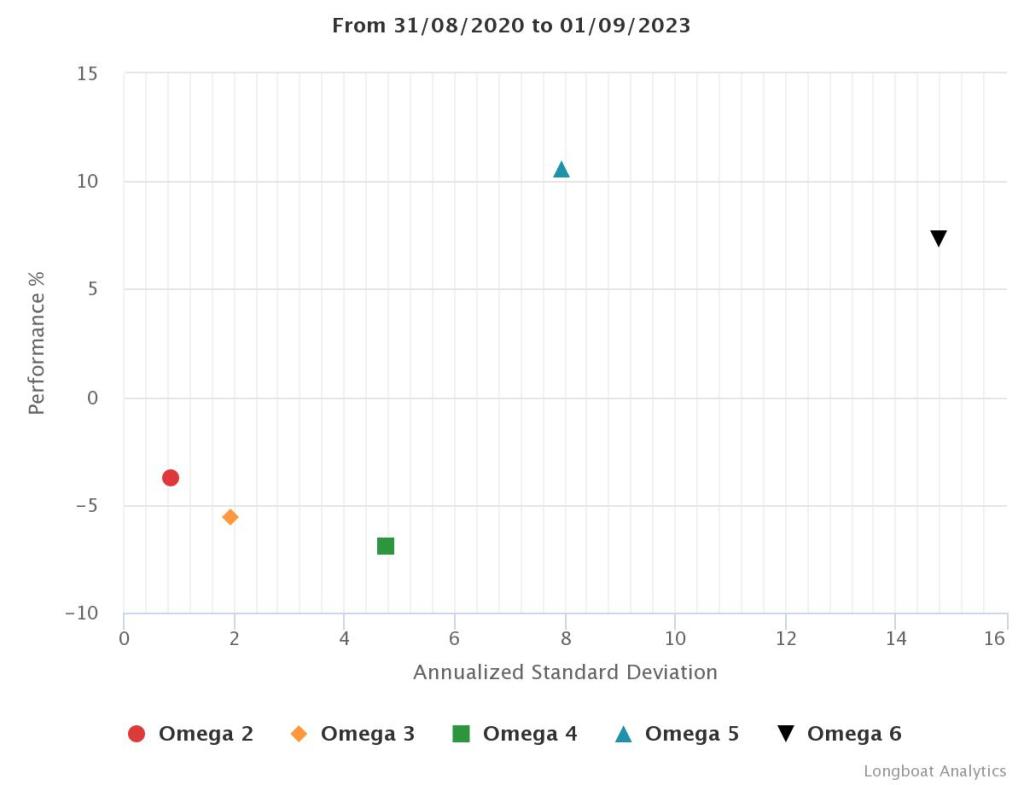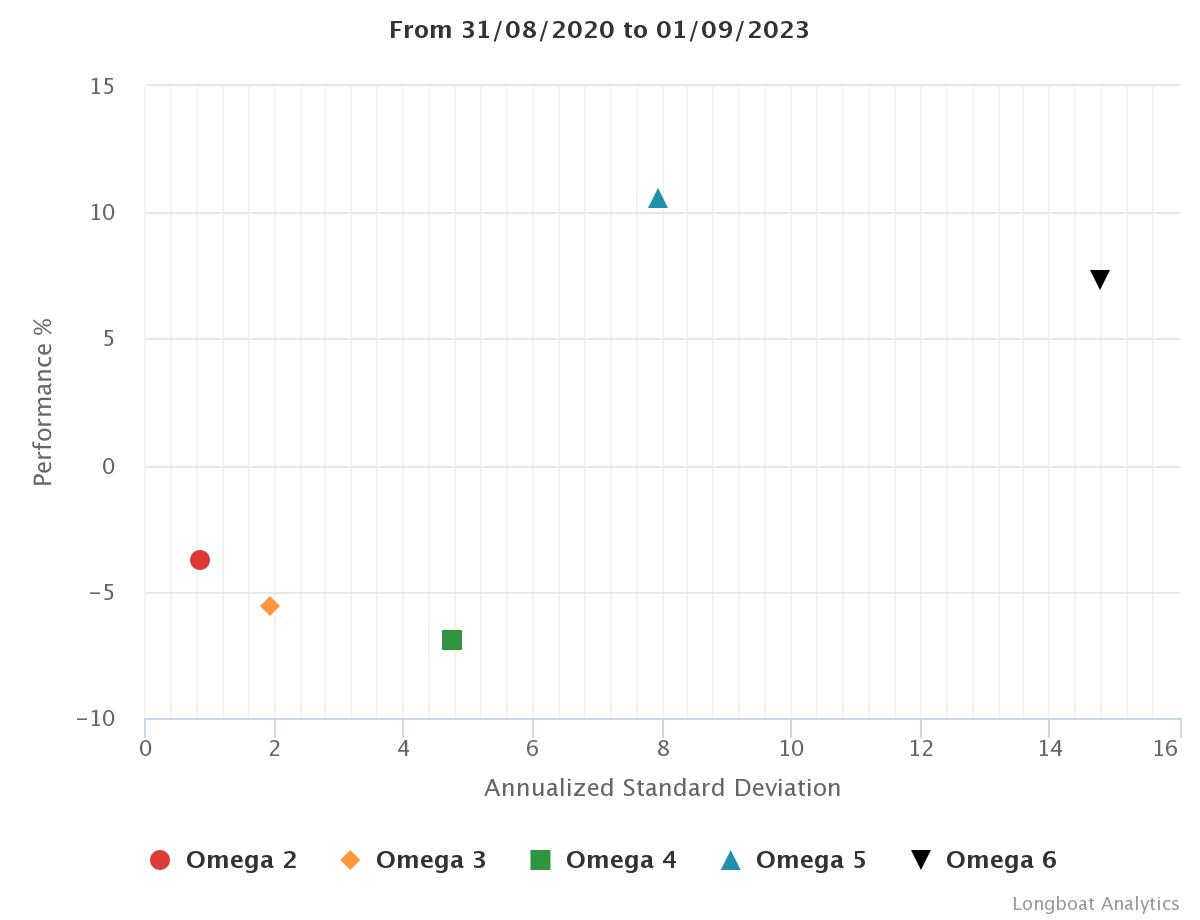 | Omega 5 | 10.54% | 3.39% | 7.9273 | -14.7126% | 1.0789 |