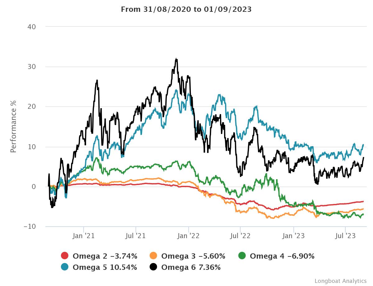 | Omega 3 | -5.60% | -1.90% | 1.9384 | -9.8868% | 0.8273 |