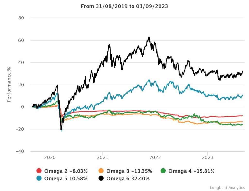 | Omega 4 | -15.81% | -4.21% | 5.8697 | -20.6263% | 0.8703 |