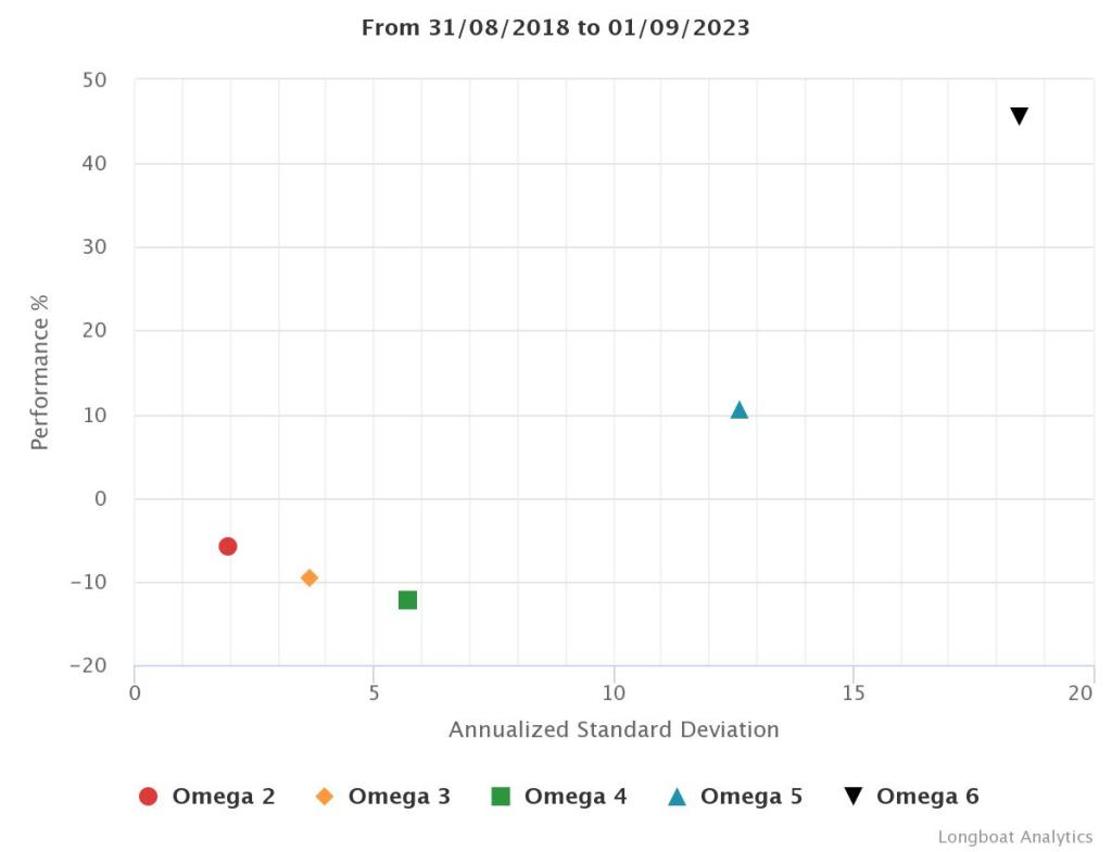 | Omega 5 | 10.50% | 2.02% | 12.6310 | -30.7982% | 1.0460 |