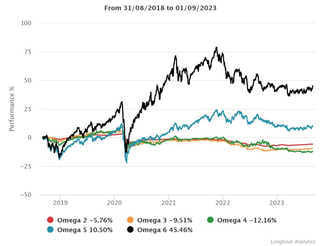 | Omega 4 | -12.16% | -2.56% | 5.6855 | -20.6263% | 0.9210 |