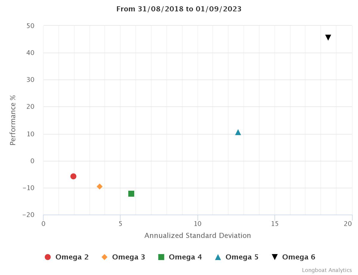 | Omega 4 | -12.16% | -2.56% | 5.6855 | -20.6263% | 0.9210 |