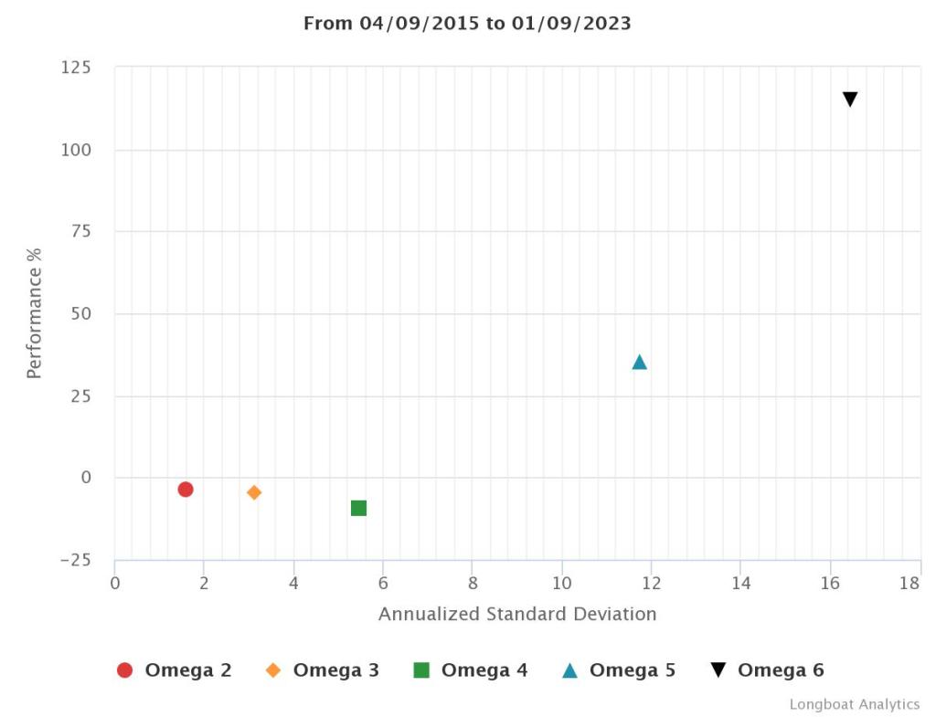 | Omega 5 | 35.23% | 3.85% | 11.7530 | -30.7982% | 1.0759 |