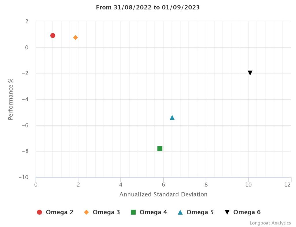| Omega 6 | -2.00% | -2.00% | 10.0900 | -8.7321% | 0.9765 |
