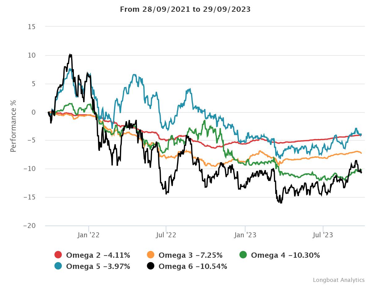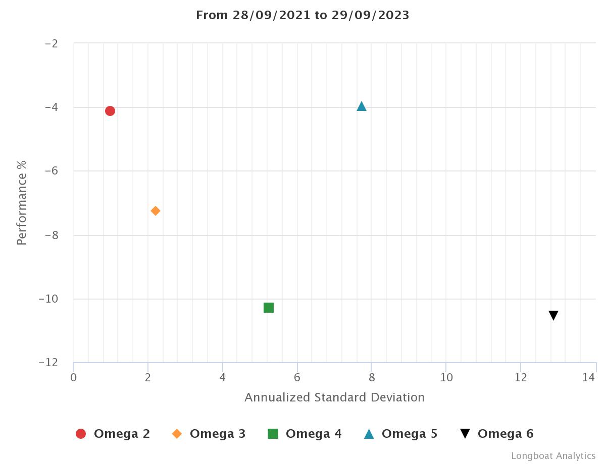| Omega 4 | -10.30% | -5.29% | 5.2321 | -13.3142% | 0.8299 |