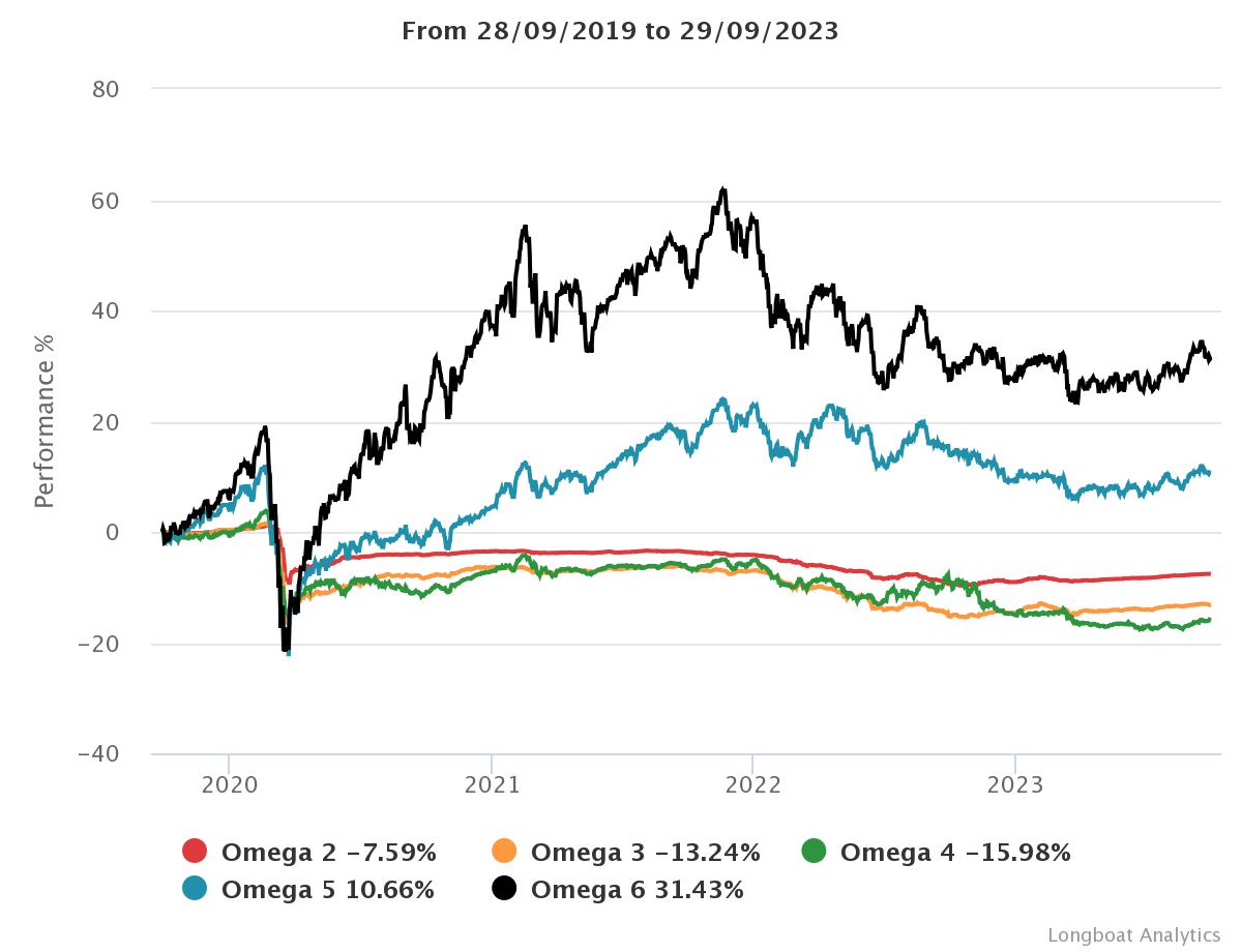 | Omega 4 | -15.98% | -4.26% | 5.8158 | -20.6263% | 0.8669 |