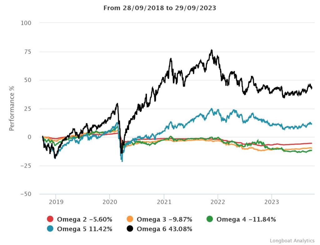| Omega 4 | -11.84% | -2.49% | 5.6876 | -20.6263% | 0.9233 |