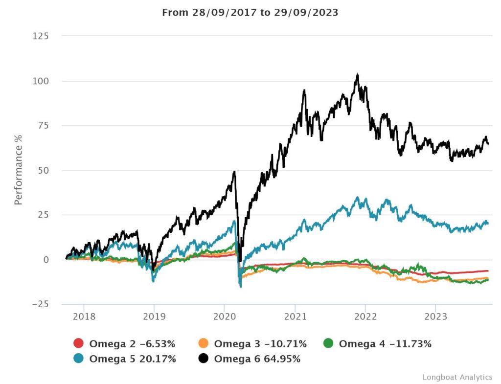 | Omega 6 | 64.95% | 8.70% | 17.4473 | -34.1986% | 1.1102 |